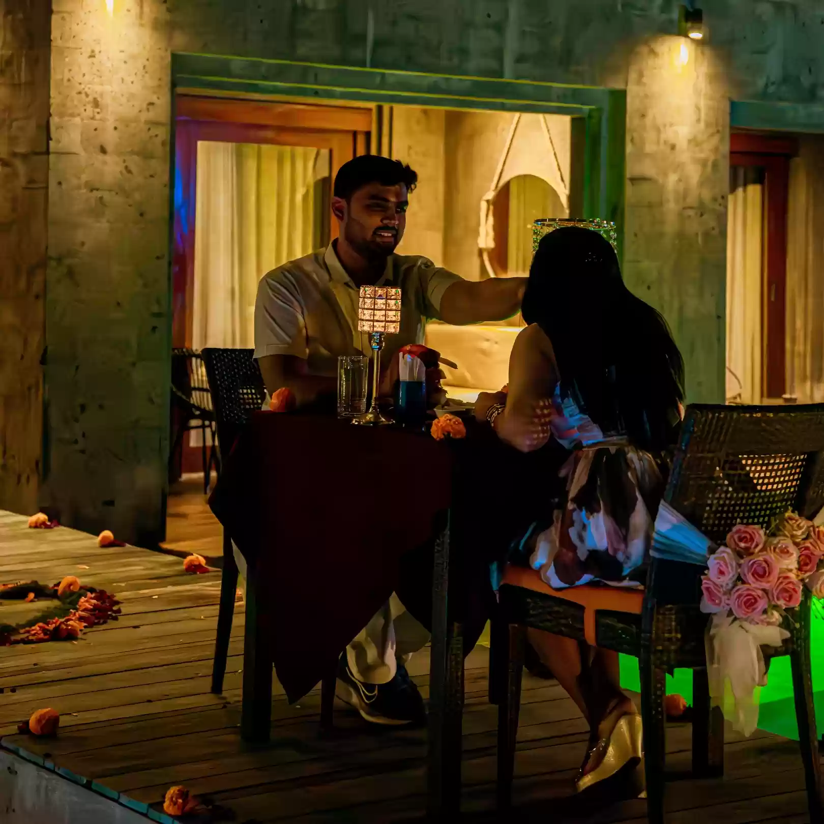 As daylight fades, the rooftop atmosphere softens. Candle light dining creates a calm and intimate setting that suits relaxed evening moments.